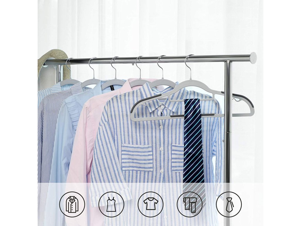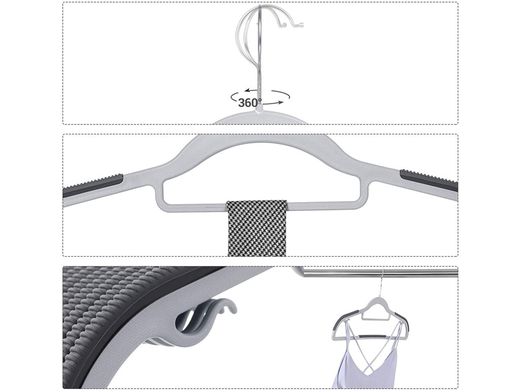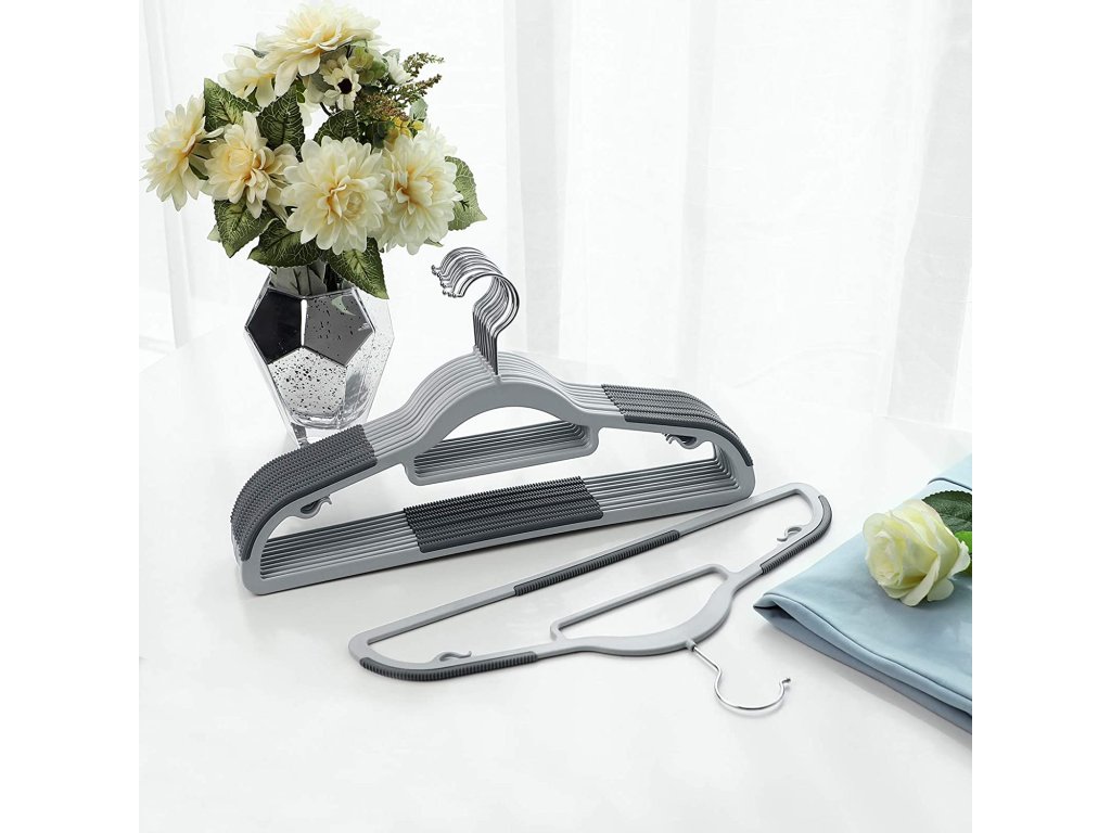 Ak vás už nebaví zhromažďovať oblečenie, ktoré vám vždy spadne z vešiakov, potom táto sada vešiakov stojí za vyskúšanie. Vylepšené protišmykové gumové časti vytvárajú účinné úchyty, takže z nich nič neskĺzne - ani hodvábna blúzka.
