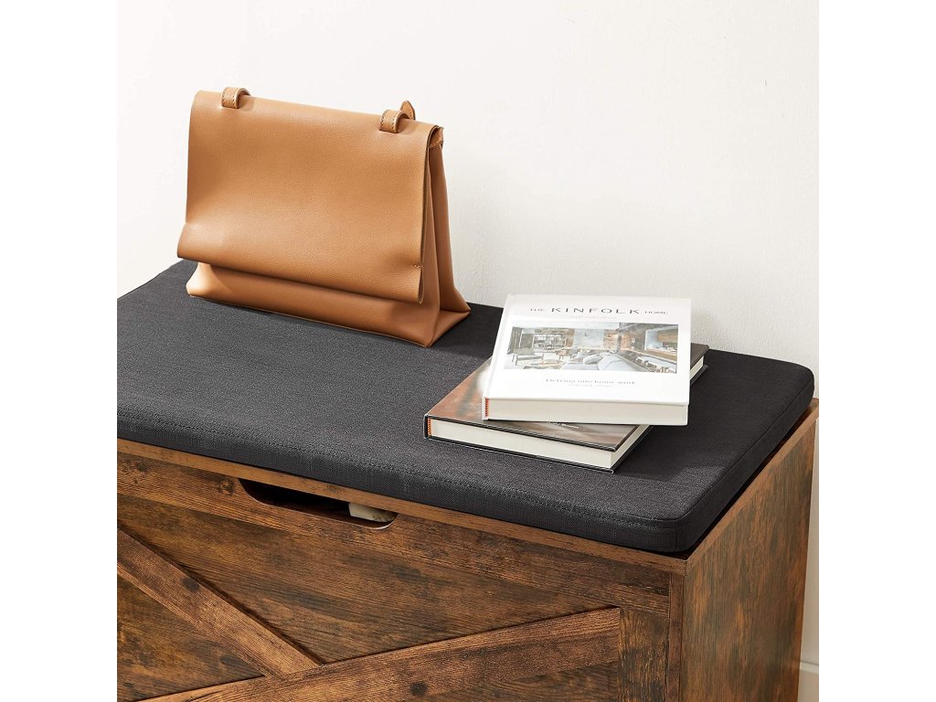 Dizajnový viacúčelový stojan na topánky s čalúneným sedadlom.