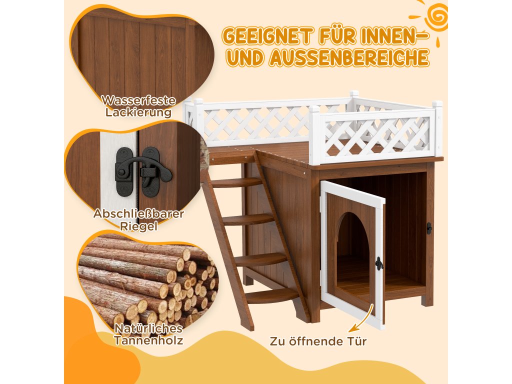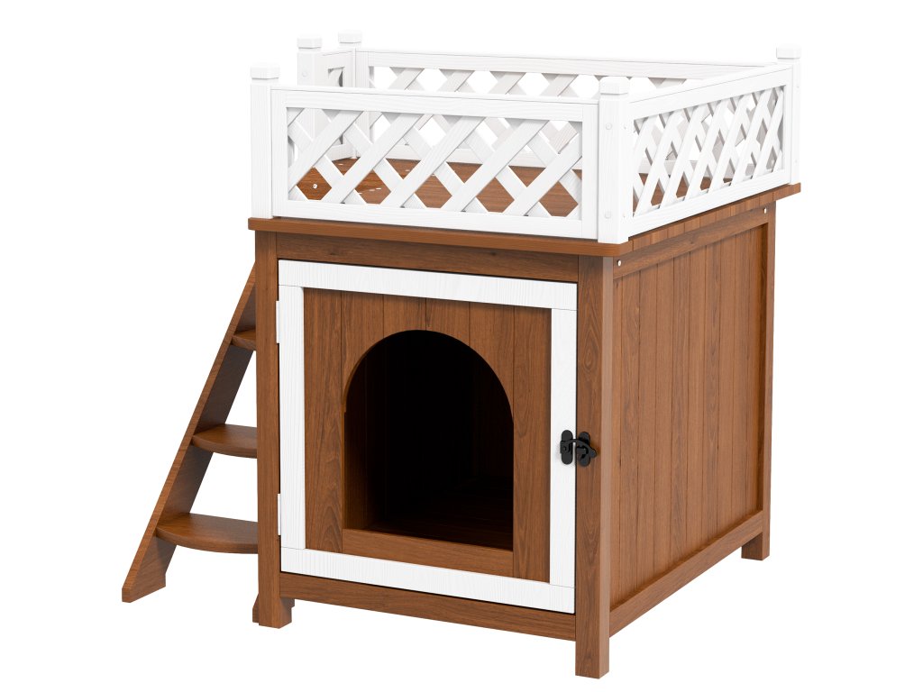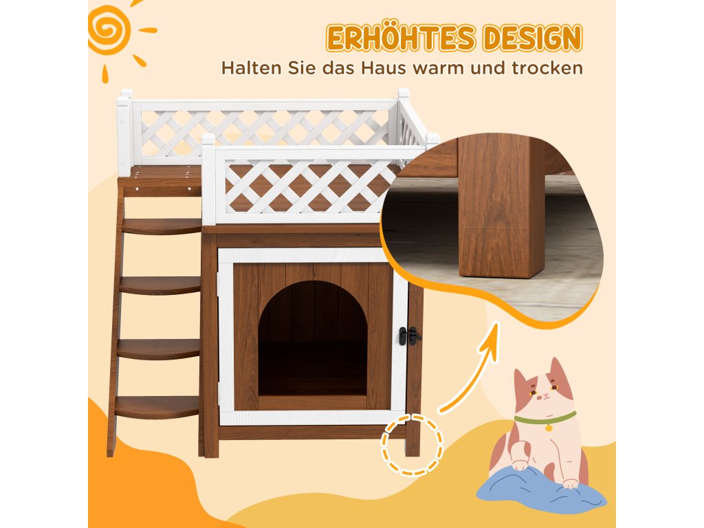 Táto malá búda pre zvieratá má schody pre ľahký prístup a zvýšený dizajn pre väčšie pohodlie. Všestranný vonkajší domček pre mačky slúži aj ako nenápadné umiestnenie pelechu, je vyrobený z prírodného jedľového dreva a je vhodný pre vnútorné aj vonkajšie použitie.