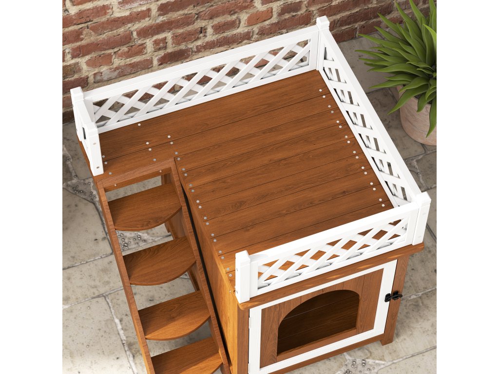 - Obsahuje útulný mačací domček na prízemí a priestranný balkón na poschodí, obklopený ozdobným plotom. Schodisko v mačacom domčeku prepája obe poschodia a uľahčuje lezenie – ideálne na hranie a relaxáciu.