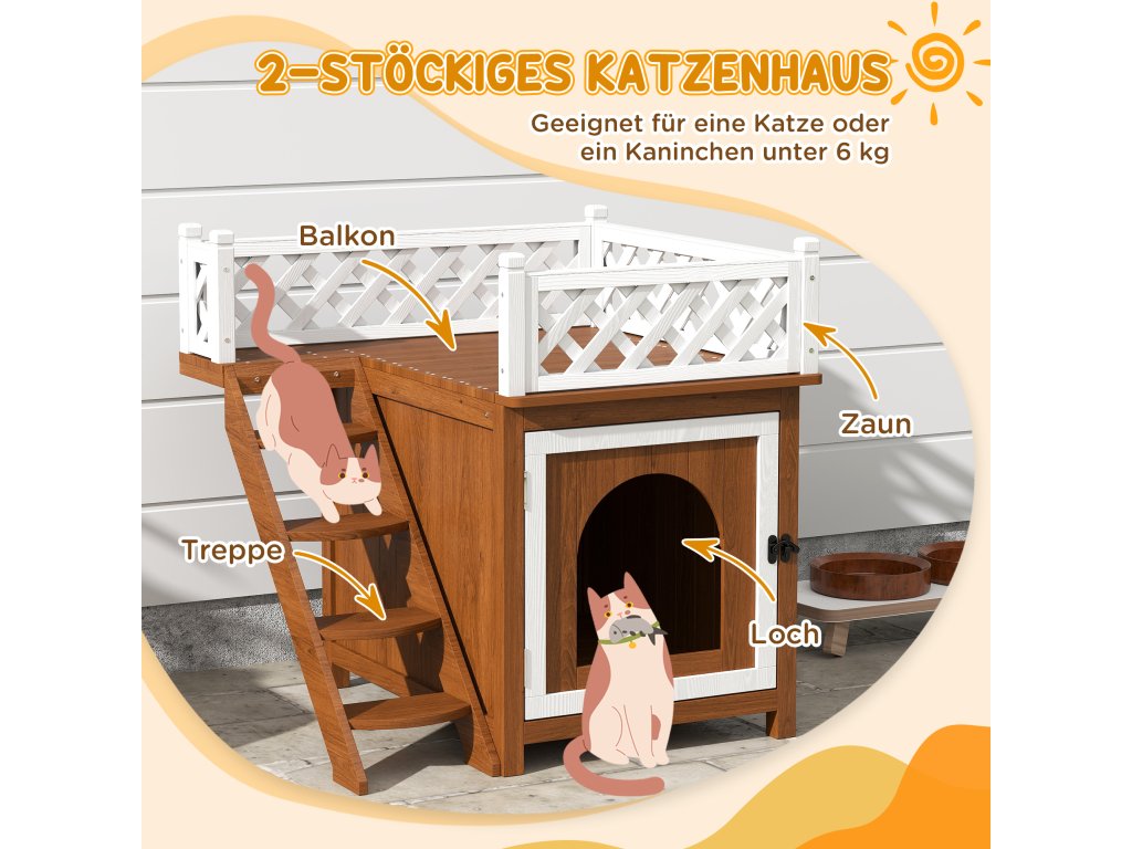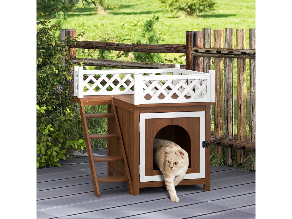Útulný mačací domček má na prízemí úkryt a priestranný balkón na poschodí, obklopený ozdobným plotom