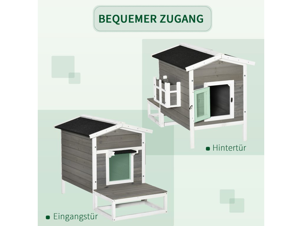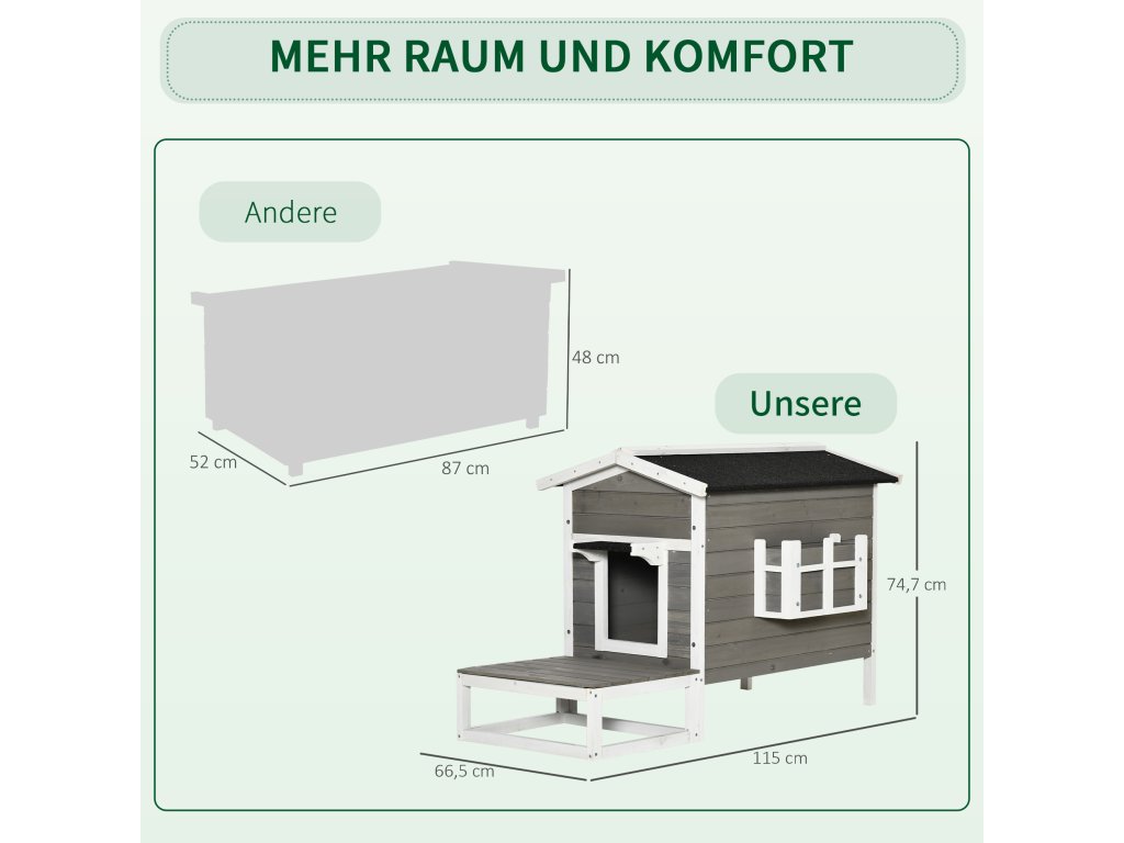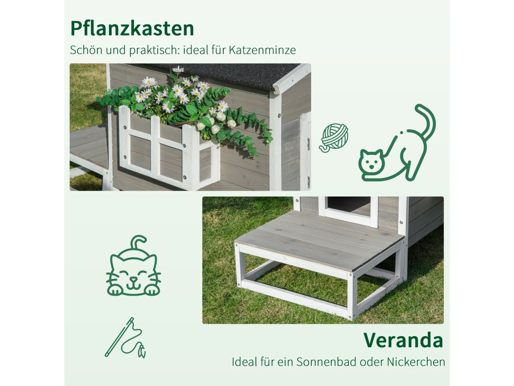 Veľká terasa je ideálnym miestom pre hranie a leňošenie na slnku. Vnútro je obzvlášť pohodlné ubytovanie pre voľne pobehujúce mačky. Vďaka vodeodolnému náteru na streche a zvýšenej podlahe zostane dom vždy suchý. Urobte svojim mačkám radosť ich vlastným domčekom!