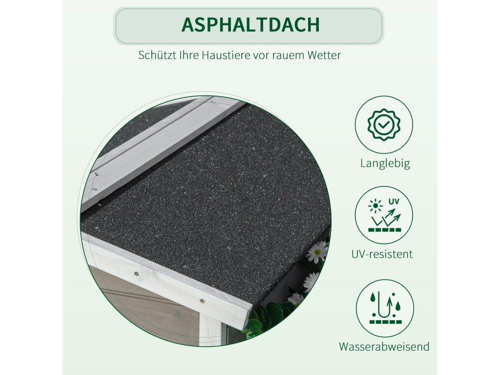 - ✔ Hlavný dom so sedlovou strechou pokrytou bitúmenovou plsťou, ktorá chráni vašich miláčikov pred nepriazňou počasia