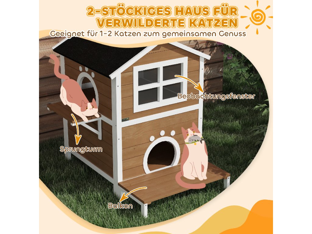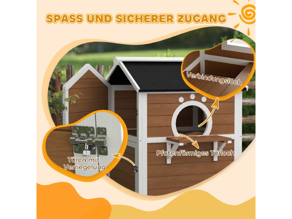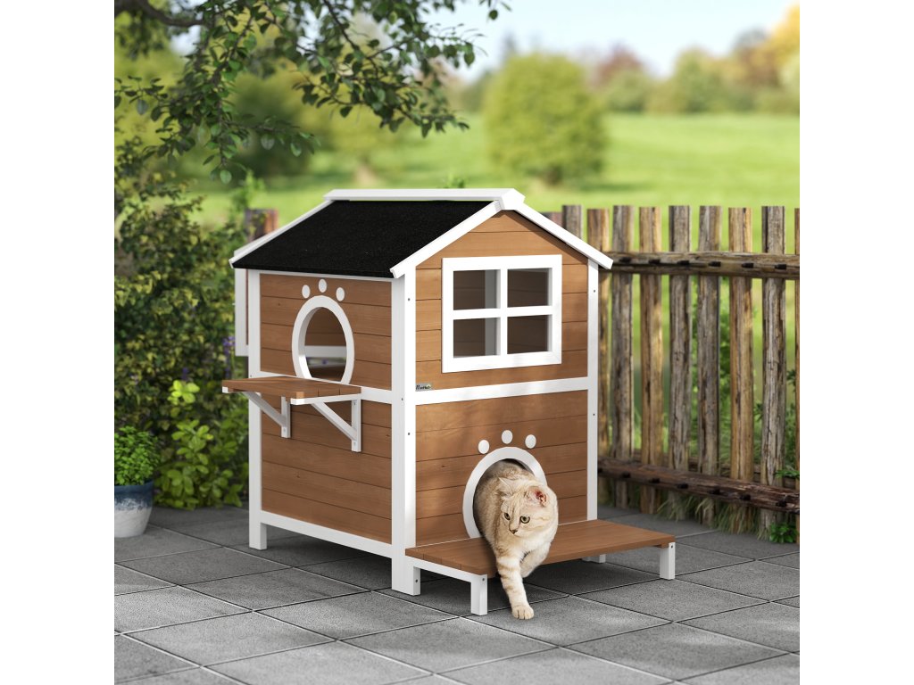 - Vďaka interaktívnej dvojposchodovej štruktúre má tento domček pre mačky spojovací brloh pre objavovanie, bočnú skákaciu plošinu a slnečný balkón pre relaxáciu