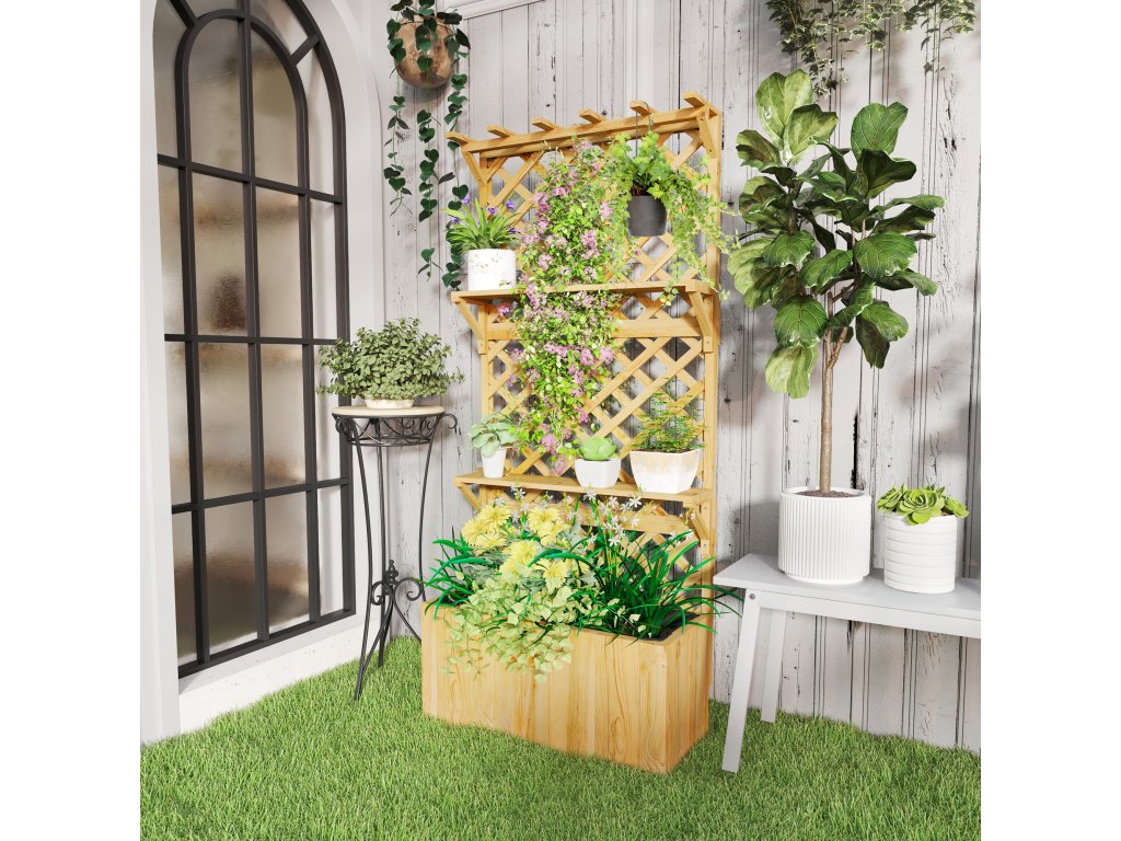 Vyskúšajte vertikálne záhradkárčenie s kombinovaným vyvýšeným záhonom s mriežkou od spoločnosti Outsunny! Mriežka na kvetináče je ideálna pre popínavé rastliny a je vybavená strešnou lištou a dvoma policami na závesné koše, malé kvetináče a dekorácie. Odtokové otvory vyvýšeného záhonu integrované do kvetináča zabraňujú zamokreniu a zabezpečujú zdravý rast vašej zelene. Elegantné a praktické riešenie pre všetkých záhradných nadšencov!