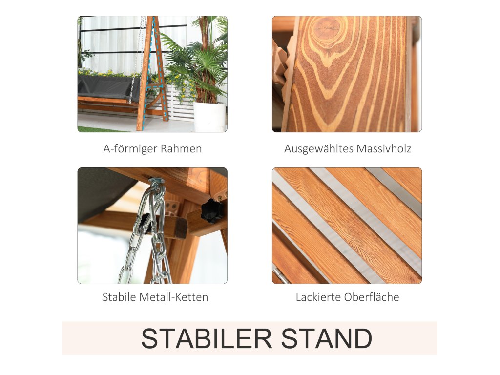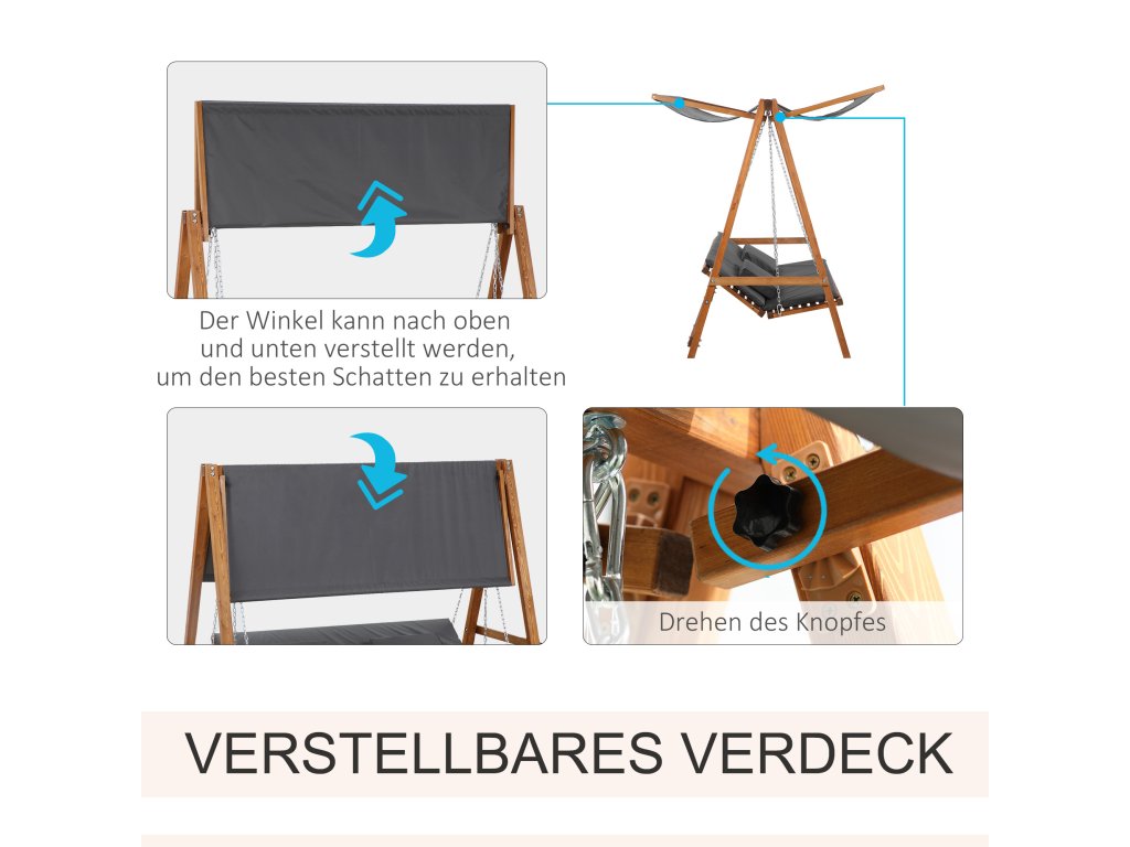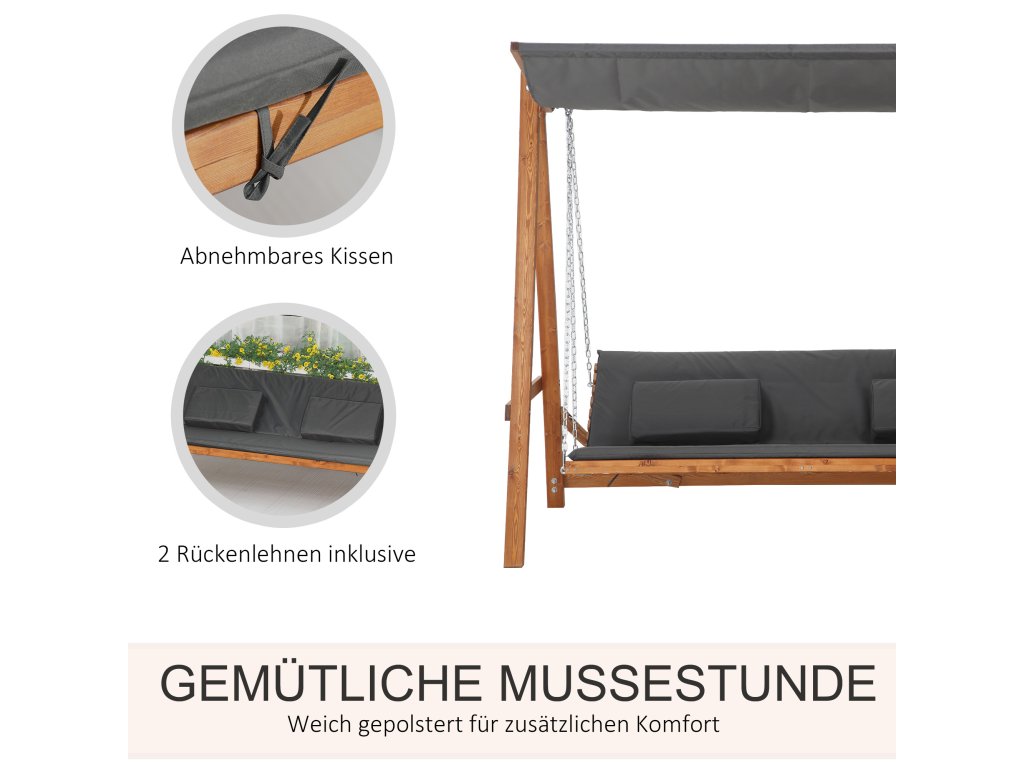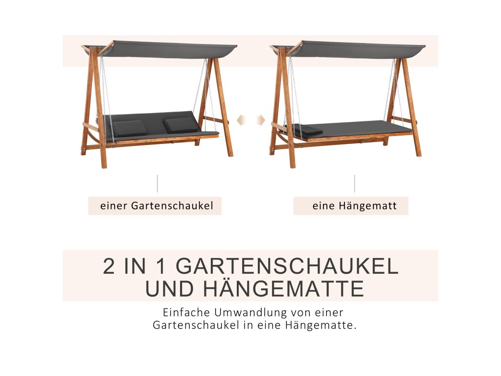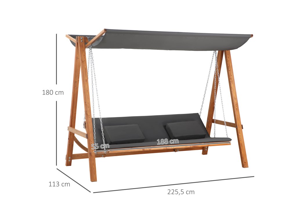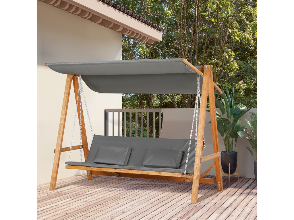 Vychutnajte si teplé letné dni naplno s touto veľkou záhradnou hojdačkou od spoločnosti Outsunny! Ponúka dostatok priestoru pre tri osoby a dá sa ľahko premeniť na posteľ. Je vyrobená z pevného a spoľahlivého masívneho dreva a má kovovú závesnú reťaz odolnú voči poveternostným vplyvom, takže sa budete vznášať vo vzduchu. Pod ochranným krytom strechy vždy nájdete chladivý vánok, takže si môžete vychutnať relaxačné zakončenie dňa.